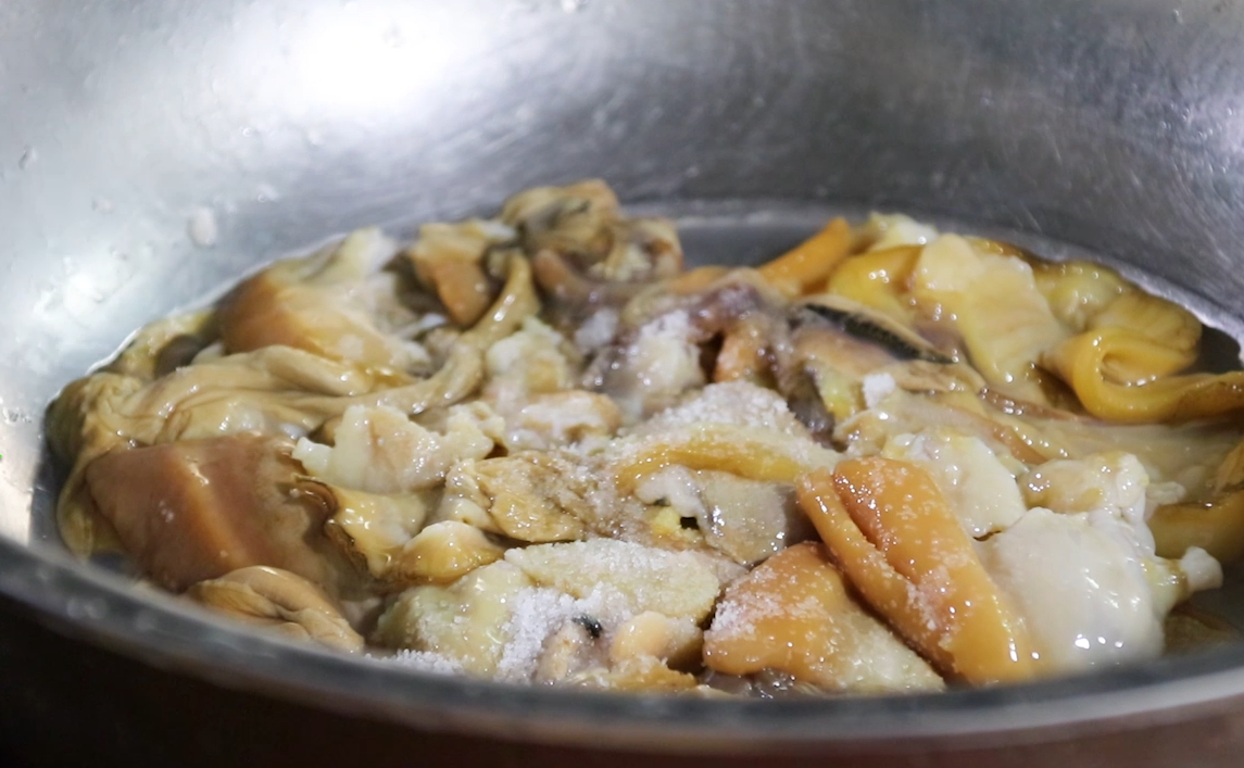 2、把准备好的河蚌处理一下:先把河蚌的壳去掉,再把里面黑色东西挤掉,放点盐和料酒反复的揉搓,揉搓至没有粘液,再放清水里多冲洗几遍。