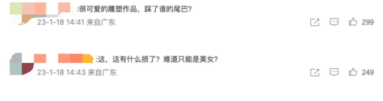 不过,还有更多网友表示不觉得侮辱了女性形象,“为什么会有损形象呢,我觉得挺生活化的啊,难道女性全部都要身材完美像模板一样才正常吗?”“肥的女人就有损形象?”“很可爱的雕塑啊!”